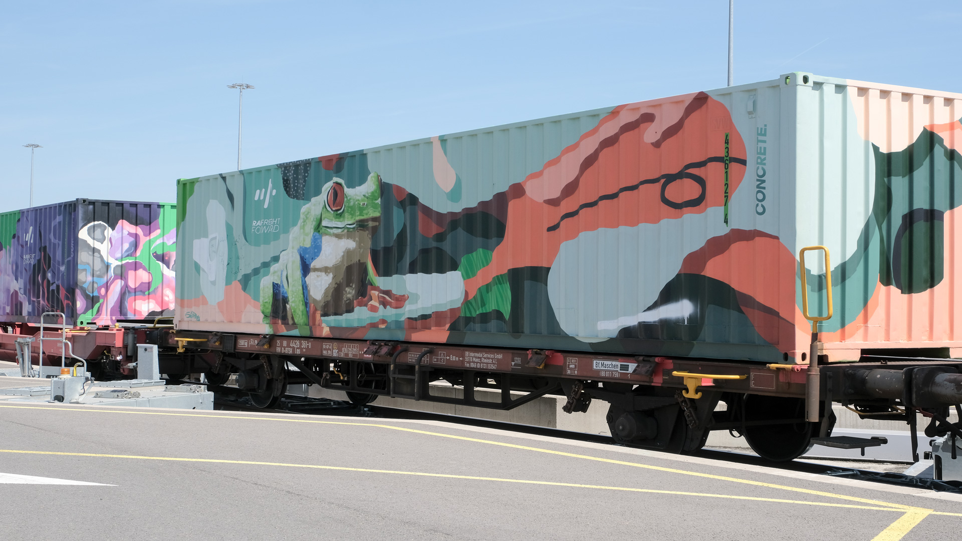 In Dudelange two containers were painted by Luxembourg artists Daniel Mac Lloyd and Alain Welter, to complete the colourful train, made up of 12 containers of Rail Freight Forward members.