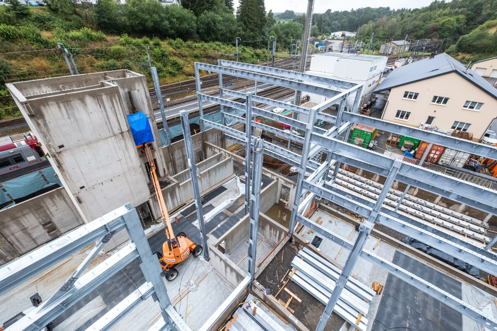 La météo maussade de début août 2023 n’aura pas eu raison de la motivation des ouvriers. Alors qu’une équipe s’attèle à la soudure d’un support pour une poutre en acier, une autre est occupée à poser les éléments métalliques complémentaires pour former la structure du nouveau P+R de la gare CFL de Troisvierges.